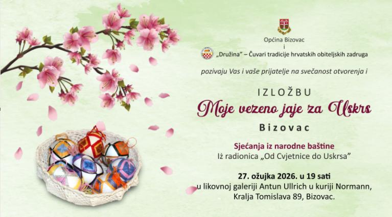 Općina Bizovac i Udruga „Družina“ pozivaju sve ljubitelje tradicijske kulturne baštine i narodne umjetnosti na svečano otvorenje izložbe pod nazivom „Moje vezeno jaje za Uskrs“.